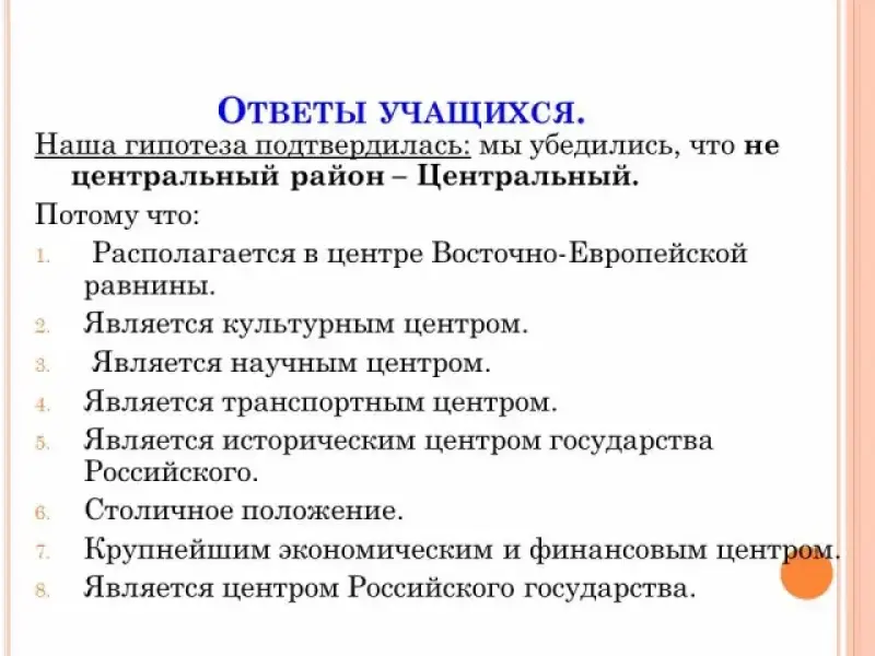 Работа с текстом. А теперь, ребята, обратите внимание на приложение 1, прочитайте текст и ответьте на вопрос. Каково значение Центрального района? (слайд 15) (5 минут)