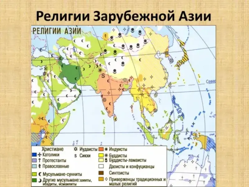 - Каков религиозный состав населения региона? (Слайд 14) Проанализируйте в атласе карту "Религии" на стр. 18. (Зарубежная Азия - родина всех трех мировых религий, а также многих крупных национальных и региональных религий-индуизма, конфуцианства, даосизма, синтоизма, иудаизма и др., которые в течение многих веков и даже тысячелетий оказывали oгpoмнoe влияние на политику, экономику, духовную культуру, воспроизводство населения, обычаи народов). Вывод: центр крупнейших мировых религий.