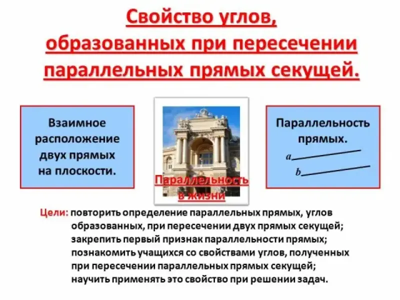 познакомить учащихся со свойствами углов, полученных при пересечении параллельных прямых секущей;