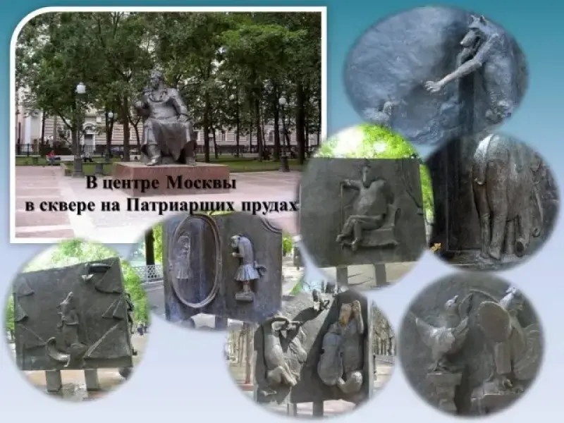 Учитель литературы: В центре Москвы в сквере на Патриарших прудах есть оригинальный скульптурный ансамбль, в центре которого на скамье расположился сам Иван Андреевич, а рядом с бронзовых страниц его книг выступают фигуры знакомых каждому Кукушки и Петуха, Вороны и Лисицы, Осла, Козла и косолапого Мишки, вместе с проказницей Мартышкой. Иван Андреевич Крылов сидит, глубоко задумавшись. О чём он думает? Может быть, на закате жизни вспоминает свое нелегкое детство? Слайд 2