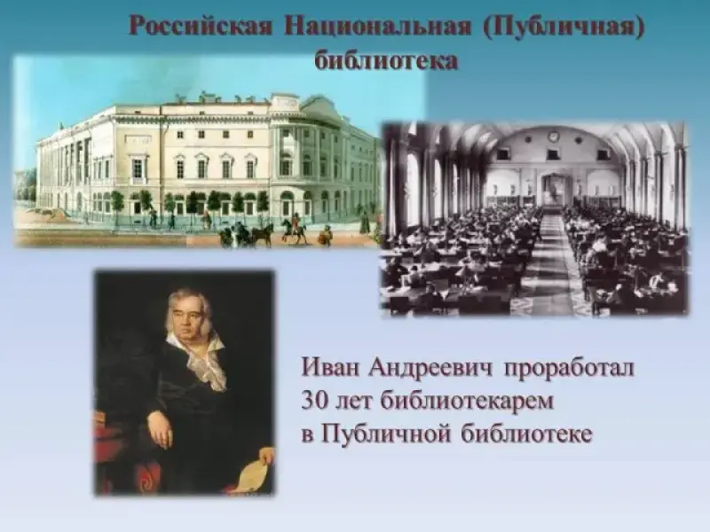 Учитель литературы: Родился И. А. Крылов в семье армейского офицера. Десять лет было мальчику, когда отец умер. Семья, и без того небогатая, осталась без средств к существованию. Крылов вынужден был пойти в канцелярию Калязинского земского суда. Потом он работал в Тверском магистрате, а на досуге самостоятельно изучал французский и итальянский языки, математику и русскую литературу. Приехав в Петербург, он стал сначала журналистом, а потом - библиотекарем в Публичной библиотеке, где проработал 30 лет. Свою литературную деятельность И.А. Крылов начинал как драматург - автор произведений для театра. Но прославился он своими баснями. Слайд 3
