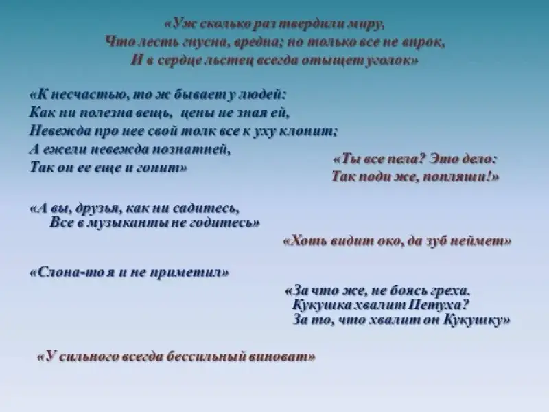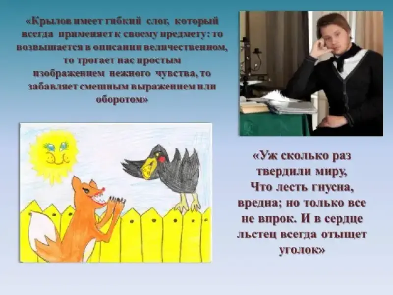 Учитель литературы: Басни Крылова легко запоминаются - такие они ясные, складные. А многие фразы из них стали крылатыми: "Ларчик просто открывался", "А вы, друзья, как ни садитесь, все в музыканты не годитесь", - говорим мы, порой даже не думая, что цитируем героев произведений Крылова. Слайд 5