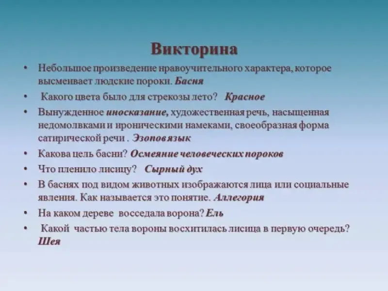 Педагог-библиотекарь проводит викторину с учащимися по басням И.Крылова. Слайд 8
