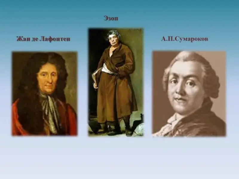 Учитель литературы беседует с учащимися о знаменитых баснописцах: По преданию в 6 веке до н.э. жил баснописец. Он был фригийским рабом, уродливым, но мудрым и проницательным человеком. Эзоп принадлежал простоватому философу Ксанфу. Впоследствии Эзоп был отпущен на волю, жил в одно время при дворе лидийского царя Креза, был обвинён в святотатстве дельфийскими жрецами и сброшен ими со скалы. Сборники прозаических басен известны под названием "Эзоповы басни".
