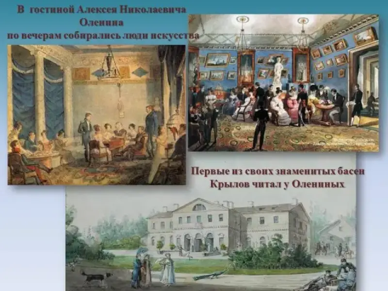 Педагог-библиотекарь: В Петербурге И. Крылов сошелся со многими известными людьми, его начинают приглашать в литературные салоны. Но чаще всего он появляется в доме президента Академии художеств - Алексея Николаевича Оленина. В оленинской гостиной по вечерам собирались люди искусства, такие, как художник Кипренский, актриса Екатерина Семенова, молодые поэты Гнедич и Батюшков, знаменитый тогда автор трагедии Озеров и творец популярной комедии "Ябеда" Капнист. Первые из своих знаменитых басен Крылов читал у Олениных. Слайд 11