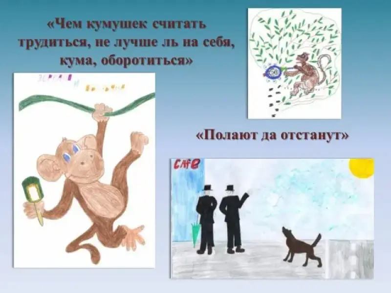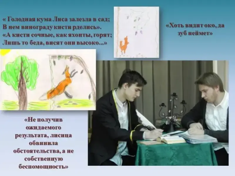 Оленин: Вот, Иван Андреевич, Полина из 1 класса нашла крылатую фразу: "Хоть видит око, да зуб неймет", и мораль, по ее мнению, заключается в том, что, не получив ожидаемого результата (вкусного и спелого винограда), лисица обвинила обстоятельства (виноград, висевший слишком высоко), а не собственную беспомощность. Слайд 12