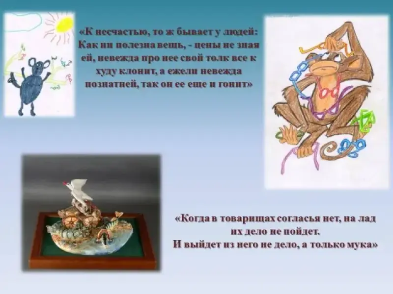 Крылов: Даше из 2 класса героиня басни "Мартышка и очки" показалась глупой. Не зная, как пользоваться очками, она посчитала их вещью бесполезной. Дашино мнение разделяет и Оля, которая советует прочитать басню, так как в ней высмеивается глупость и необразованность. Мартышка выглядит невежей, по мнению девочек. Слайд 14