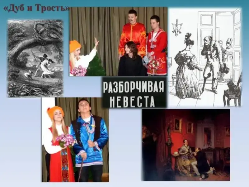 Оленин: В 1803 году Иван Андреевич Крылов написал "первую" басню (из тех, что вошли в его басенные сборники) - "Дуб и Трость", а вслед за ней "перевел" из Лафонтена еще одну - "Разборчивая невеста" и показал свои переводы поэту И. И. Дмитриеву, пользовавшемуся в то время репутацией крупнейшего баснописца. Дмитриев пришел в совершенный восторг. "Это ваш род, вы нашли его",- сказал он Крылову. Сценка11 класса. Слайд 19