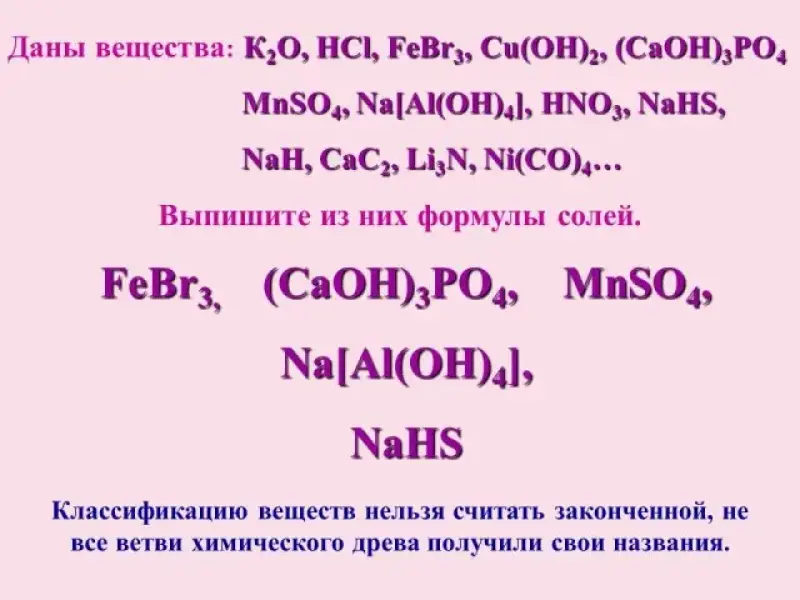 Даны вещества: K2O, HCl, FeBr3, Cu(OH)2, (CaOH)3PO4, MnSO4, Na[Al(OH)4], HNO3, NaHS, NaH, CaC2, Li3N, Ni(CO)4, NH4Cl.