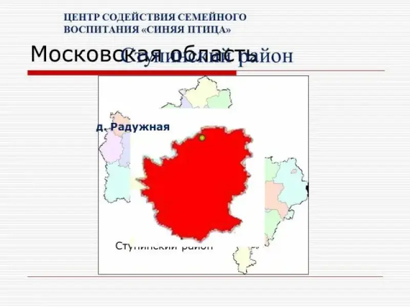2 слайд Мы живем и учимся в Ступинском районе Московской области. Территориально наш центр расположен здесь... в деревне Радужная.