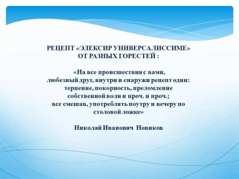Все тревоги и несчастья Н.И. Новиков старался переносить бодро. Часто приятелям он предлагал в шутку рецепт "элексир универсалиссиме" от разных горестей, вроде следующего: