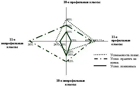 Результаты исследований, проведенных в 10-11 классах, показывают, что успеваемость (а это один из основных показателей состояния системы образования) учащихся профильных классов повышается, несмотря на увеличение учебной нагрузки, устойчивая мотивация плюс серьёзное отношение к учебе со взглядом в будущее - вот, что характерно для учащихся лицейских классов. Отмечено и повышение успеваемости в спрофилированных на вуз классах от10-го к 11-ому, что свидетельствует о повышении мотивации на обучение, адаптации учащихся к возросшей учебной нагрузке.
