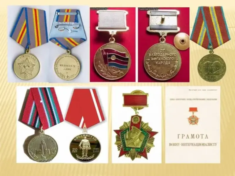 Слайд 12-13. За годы службы в Афганистане Холин Александр Васильевич был награждён "юбилейной медалью "70 лет Вооружённых сил СССР", знаком "Отличник погранвойск I степени", Грамотой ПВС СССР "За боевые действия в Афганистане". Позже к этим наградам добавились знак "Воину-интернационалисту от благодарного афганского народа" в 1990-м году и юбилейные медали к 20-летию и 25-летию вывода советских войск из Афганистана"[3].