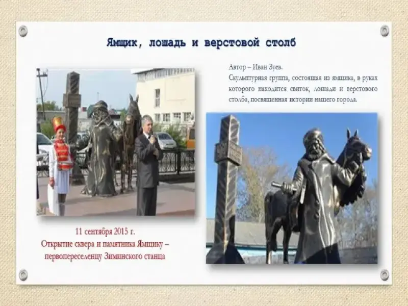 Стало общероссийской традицией устанавливать памятник в городе человеку, который его основал. 11 сентября 2015 года навсегда войдет в историю Зимы. В этот по-настоящему солнечный день горожане участвовали в торжественном и праздничном мероприятии - открытии сквера и памятника Ямщику - первопереселенцу Зиминского станца. [6]