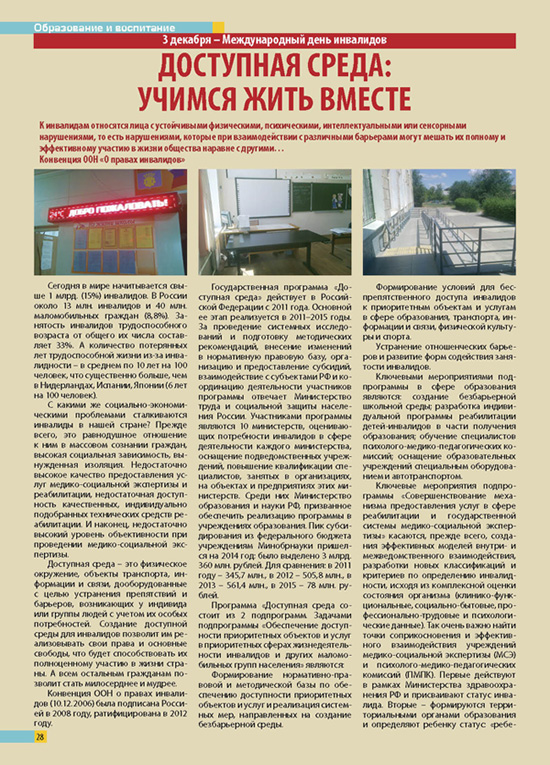 О реализации государственной программы "Доступная среда 2011-20015" в образовательных учреждениях Советского района Волгограда наша статья "Доступная среда: учимся жить вместе" в Волгоградском научно-популярном журнале "Здоровье и экология" № 12 (154) декабрь 2015. Посвящена публикация Международному дню инвалидов, который отмечается ежегодно 3 декабря. В статье рассказывается о нашем ученике Гром Кирилле. У мальчика редкий диагноз: "нейродегенеративное заболевание центральной нервной системы - церебеллит". Московские доктора наук разводят руками и говорят, что заболевание неизлечимо. Максимально что можно сделать - это купировать болезнь на той стадии, на которой она сейчас находится. И только при условии применения дорогостоящих препаратов.