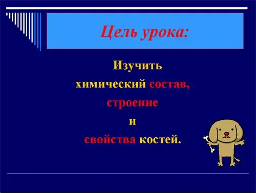 Цель урока: изучить строение, свойства и химический состав костей. <Слайд 3>