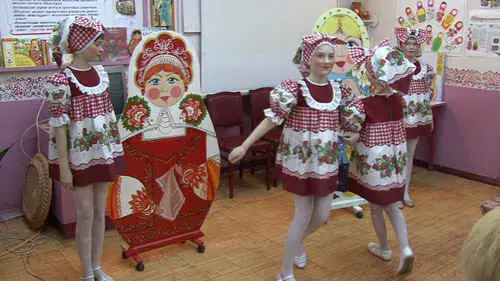 1. Матрешка - настоящая русская красавица. Румяная, в народном сарафане, на голове яркий платочек. Но матрёшка не лентяйка, в руках у неё то серп и хлебные колосья, то уточка или петушок, то корзина с ягодами или грибами. Но главное, эта куколка с секретом! Внутри неё прячутся весёлые сестрички, мал - мала - меньше. Про матрёшек придумали потешку: