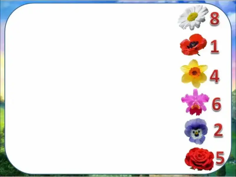 (На экране поочередно появляются цветочные примеры. Два цветка уже известны: ромашка - 8, мак - 1.)