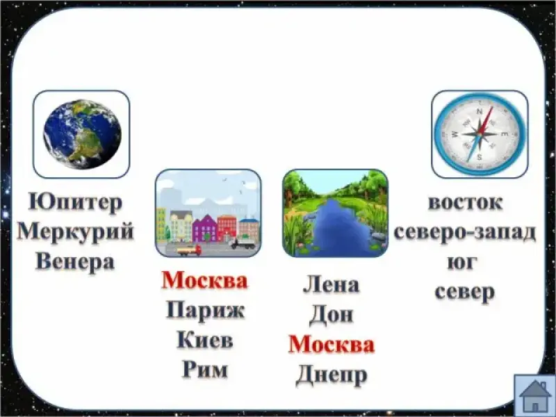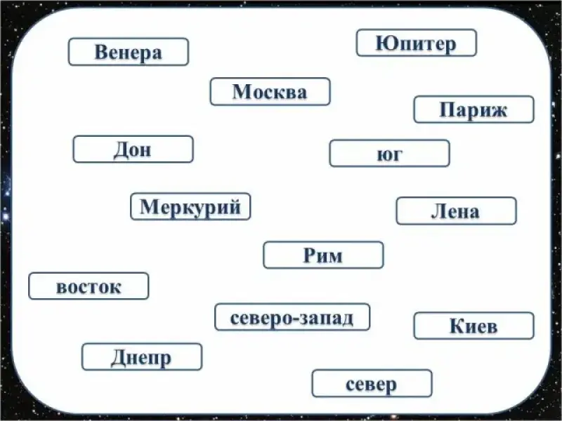 (Дети получают карточки: Юпитер, восток, Лена, Меркурий, Москва, Париж, северо-запад, Киев, Дон, Венера, Енисей, Рим, юг, Днепр, Плутон, север. Приложение 4)
