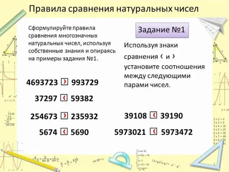 - Ребята, мы с вами знаем правило сравнения многозначных чисел, давайте повторим его устно. Посмотрите на примеры и объясните, как сравнивают многозначные числа.