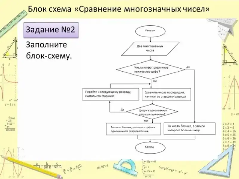Учитель предлагает ученикам записать правило сравнения двух многозначных чисел в виде блок-схемы <Рисунок 1> (Слайд 6 <Презентация>); раздает карточки с каркасом схемы <Приложение 1>.