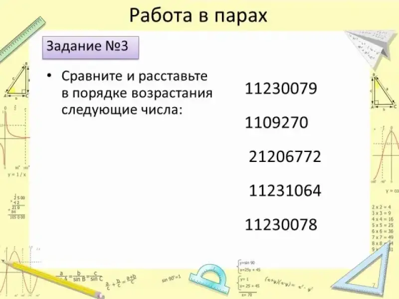 - Мы с вами заполнили блок-схему, которая поможет вам выполнить следующее задание. Работая в парах, сравните многозначные натуральные числа и запишите их в порядке возрастания (Слайд 7 <Презентация>). Все знают, что значит расставить числа в порядке возрастания? (Да, от меньшего к большему).