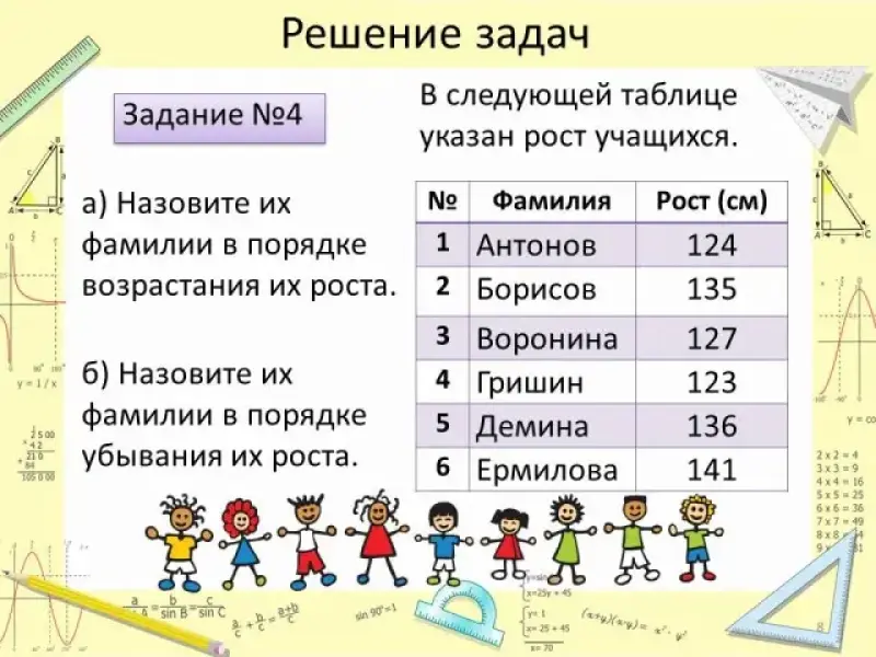 - Сравните рост учащихся и назовите их фамилии в порядке возрастания роста, в порядке убывания их роста.
