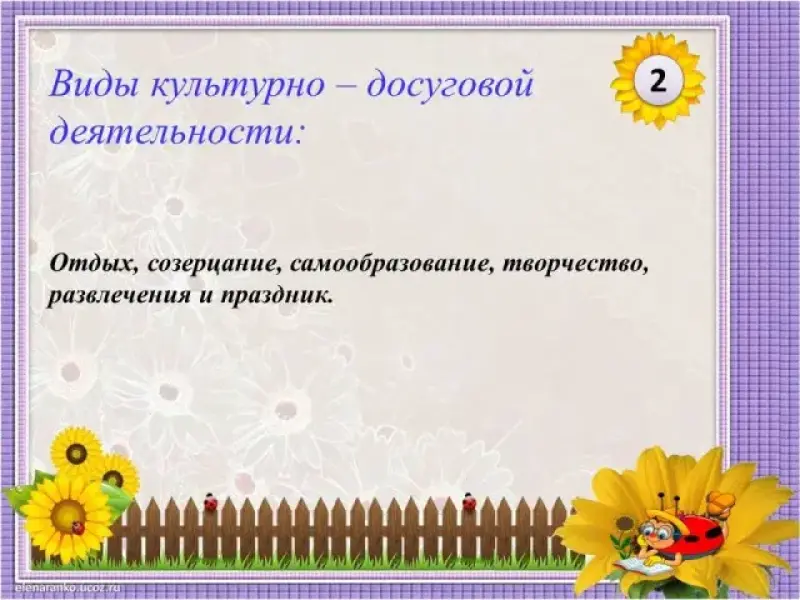 Виды досуговой деятельности очень интересные, разнообразные и доступные для маленьких детей. Каждый ребенок - это, прежде всего личность, обладающая своим характером, способностями, интересами, а также богатым внутренним миром. И задача взрослого помочь ребенку найти оптимальный для его возраста, здоровья и эмоционального благополучия вид культурно-досуговой деятельности