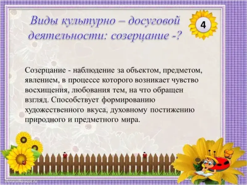Созерцание - наблюдение за объектом, предметом, явлением, в процессе которого возникает чувство восхищения, любования тем, на что обращен взгляд. Способствует формированию художественного вкуса, духовному постижению природного и предметного мира.