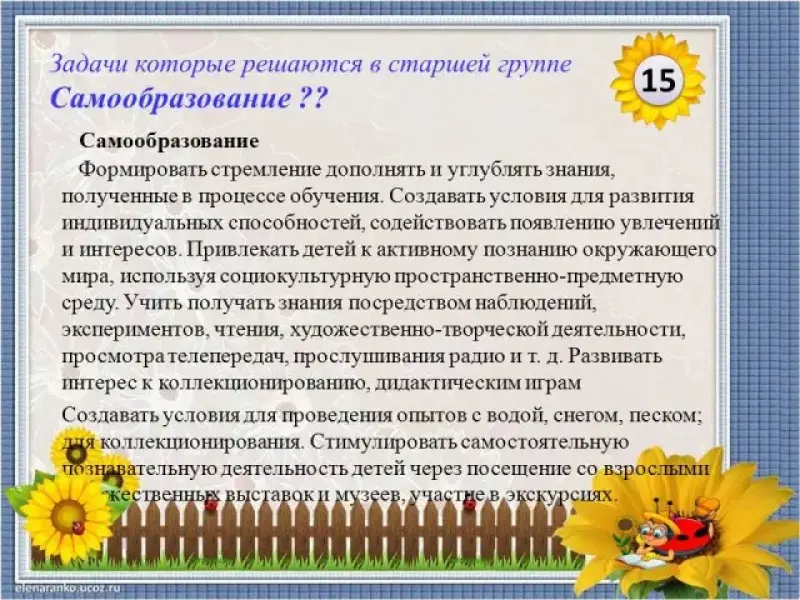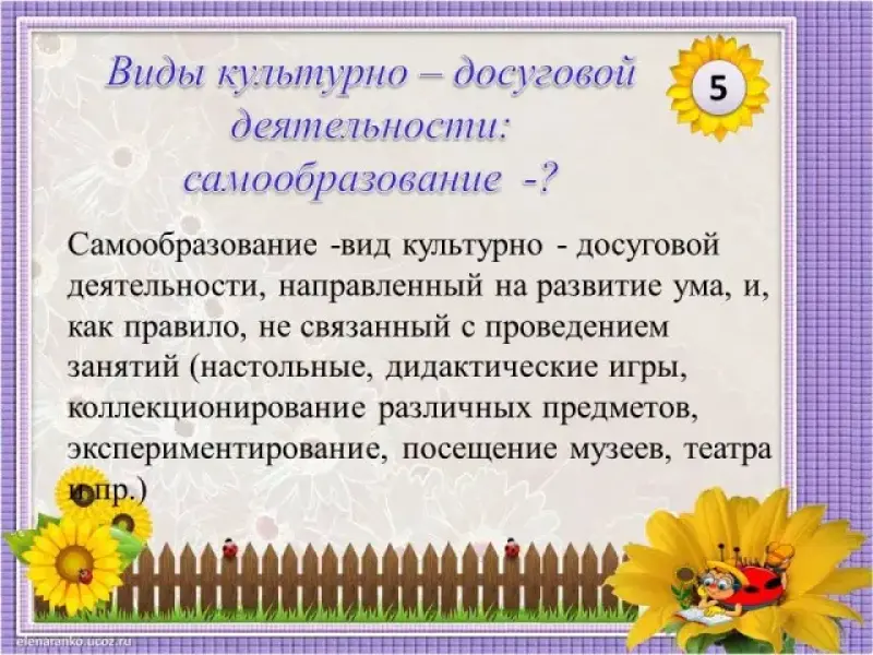 Самообразование - вид культурно-досуговой деятельности, направленный на развитие ума, и, как правило, не связанный с проведением занятий (настольные, дидактические игры, коллекционирование различных предметов, экспериментирование, посещение музеев, театра
