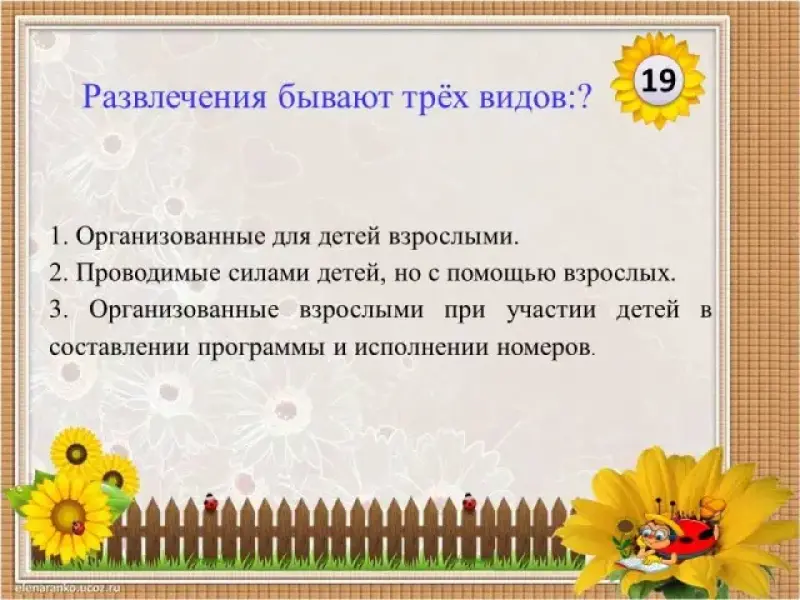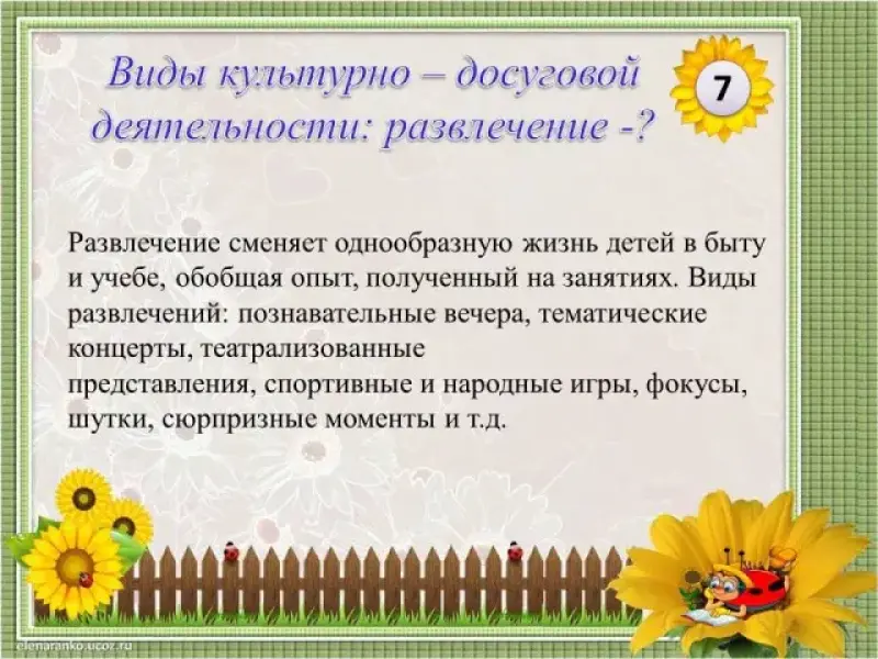 Развлечение сменяет однообразную жизнь детей в быту и учебе, обобщая опыт, полученный на занятиях. Виды развлечений: познавательные вечера, тематические концерты, театрализованные представления, спортивные и народные игры, фокусы, шутки, сюрпризные моменты и т.д.