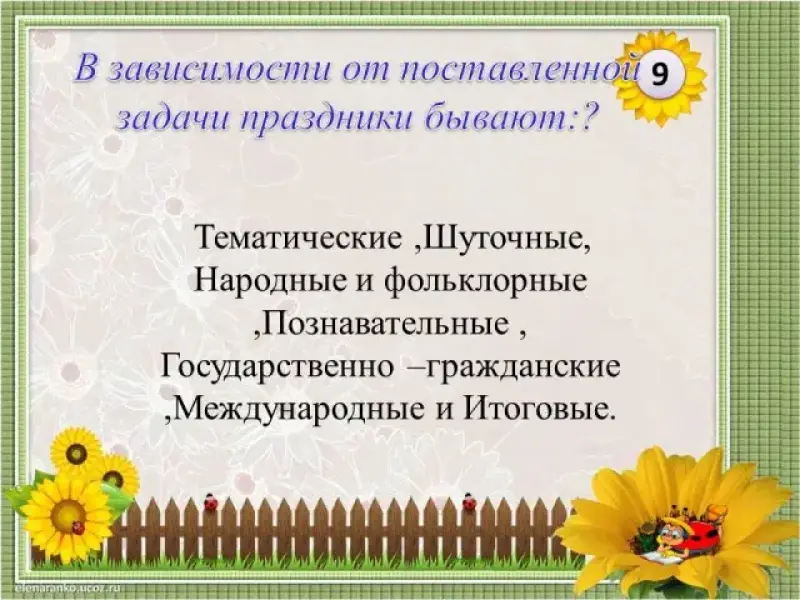 Тематические, Шуточные, Народные и фольклорные ,Познавательные, Государственно - гражданские, Международные и Итоговые.