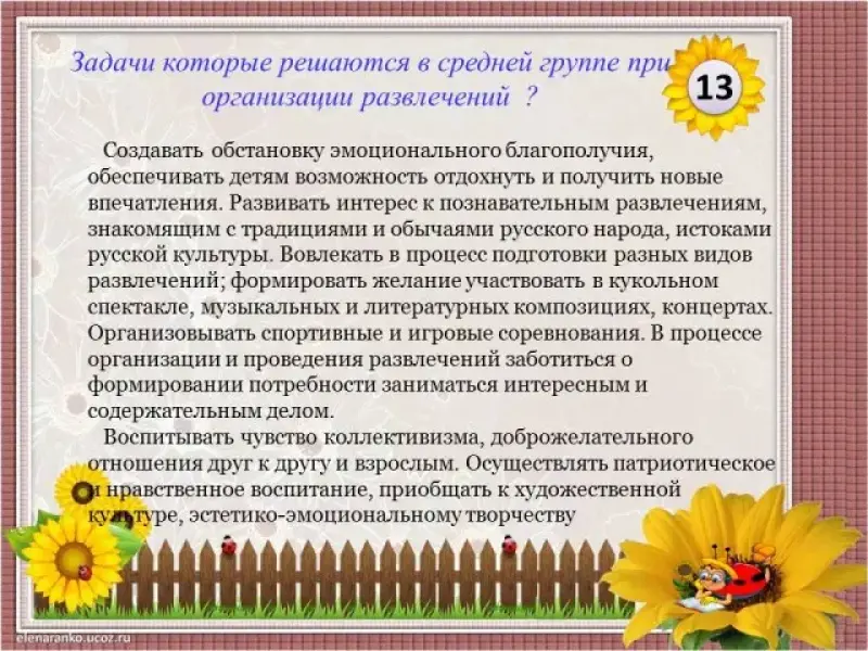 Создавать обстановку эмоционального благополучия, обеспечивать детям возможность отдохнуть и получить новые впечатления. Развивать интерес к познавательным развлечениям, знакомящим с традициями и обычаями русского народа, истоками русской культуры. Вовлекать в процесс подготовки разных видов развлечений; формировать желание участвовать в кукольном спектакле, музыкальных и литературных композициях, концертах. Организовывать спортивные и игровые соревнования. В процессе организации и проведения развлечений заботиться о формировании потребности заниматься интересным и содержательным делом.