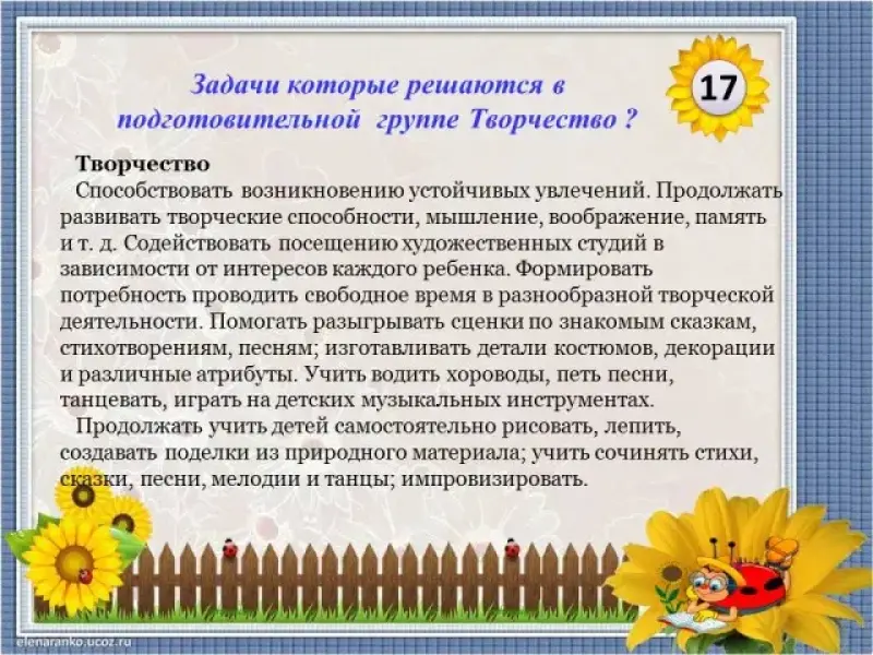 Содействовать возникновению стремления участвовать в творческой деятельности. Продолжать развивать художественные способности в пении, рисовании, музицировании. Учить само выражаться в творчестве, находить новые решения в процессе рисования, лепки, конструирования, моделирования и сочинения мелодий, песен и танцев. Поддерживать увлечения детей и создавать условия для дополнительного обучения в кружках и студиях.