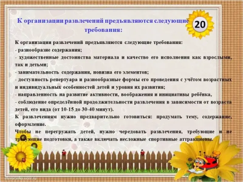 - соблюдение определённой продолжительности развлечения в зависимости от возраста детей, его вида (от 10-15 до 30-40 минут).