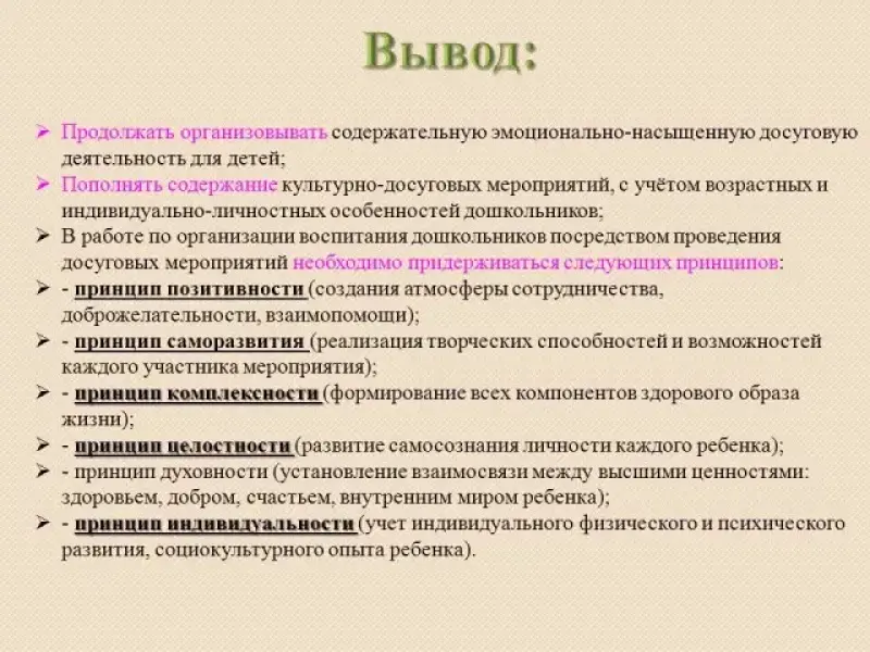 В работе по организации воспитания дошкольников посредством проведения досуговых мероприятий необходимо придерживаться следующих принципов:
