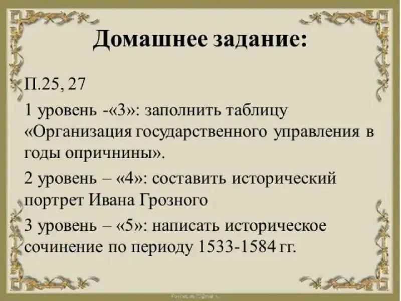 - 3 уровень (сложный) - "5": написать историческое сочинение по периоду 1533-1584 гг.
