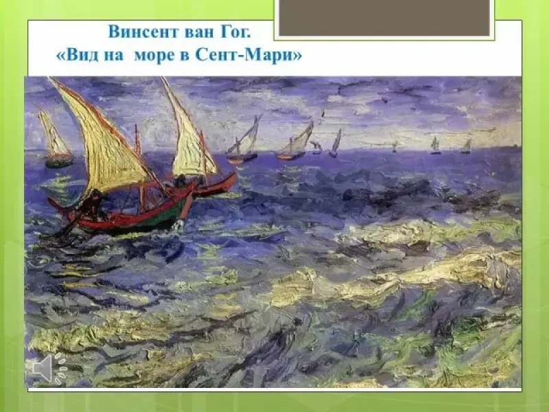 У ван Гога мы видим Средиземное море, залитое солнечным светом, с меняющейся окраской, простертое до самого горизонта. Мы словно слышим всплеск волн: вот они, голубые, синие, светло-зеленые, почти белые...