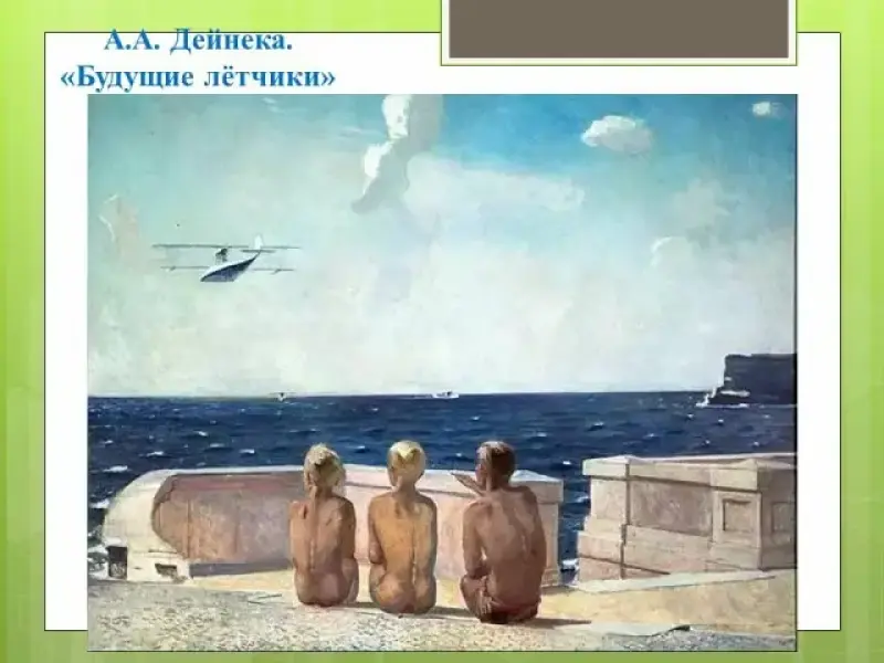 Картина Дейнеки заставляет улыбнуться, вспомнить о солнечном летнем дне, о чем-то хорошем. У моря, как и у неба, звонкая и веселая синева. И хотя герои картины сидят к нам спиной, мы чувствуем их заинтересованность летящим гидропланом.