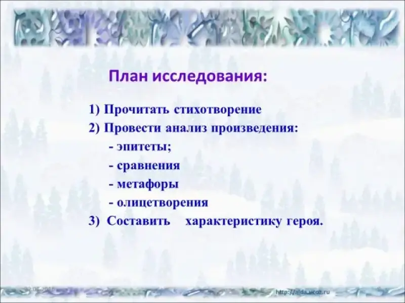 - При помощи, каких видов работ мы сможем это узнать? Как мы сможем это сделать? Прочитать стихотворение Провести анализ произведения Составить характеристику героя. (Найти в стихотворении эпитеты, олицетворения, сравнения (т.е. такие приёмы описания, при помощи которых мы можем точнее, полнее представить образ этого героя) - Посмотрите, что же у нас получилось? Слайд |