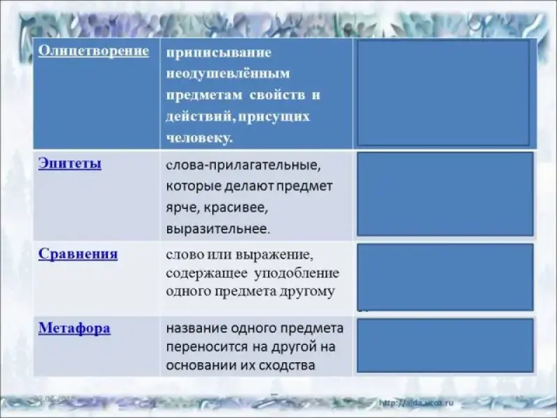 - Ну а раз Мороз-воевода сказочный герой, то давайте попробуем найти в тексте те литературные приёмы, которые использовал Некрасов, чтобы мы ясно представили этого сказочного героя в образе живого человека. Что это за приёмы? (Слайд) |