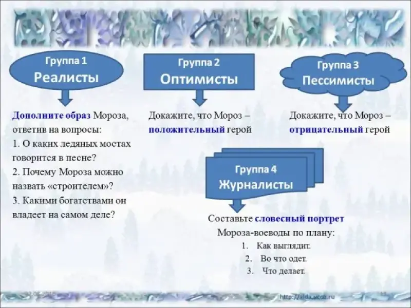 Метафора - название одного предмета переносится на другой на основании их сходства Проведём исследования в группах Слайд 1 группа: "Реалисты" Дополните образ Мороза, ответив на вопросы: 1. О каких ледяных мостах говорится в песне? 2. Почему Мороза можно назвать "строителем", "созидателем"? 3. Какими богатствами он владеет? 2 группа: "Оптимисты" Докажите, что Мороз - положительный герой 3 группа: "Пессимисты" Докажите, что Мороз - отрицательный герой 4 группа: "Журналисты" Словесно нарисуйте образ Мороза-воеводы |