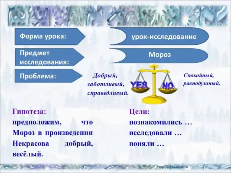 - Каким здесь нам представляется Прадедушка Мороз? - Итак, что будет предметом нашего исследования? - Предположите, какой мороз - мороз - природное явление или мороз - литературный персонаж? Почему? - Вы совершенно правы. - Итак, каким может быть Мороз в литературных произведениях? А может быть? От чего это зависит? Возникла проблема? |