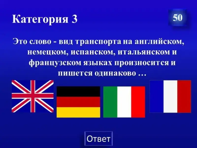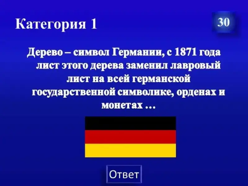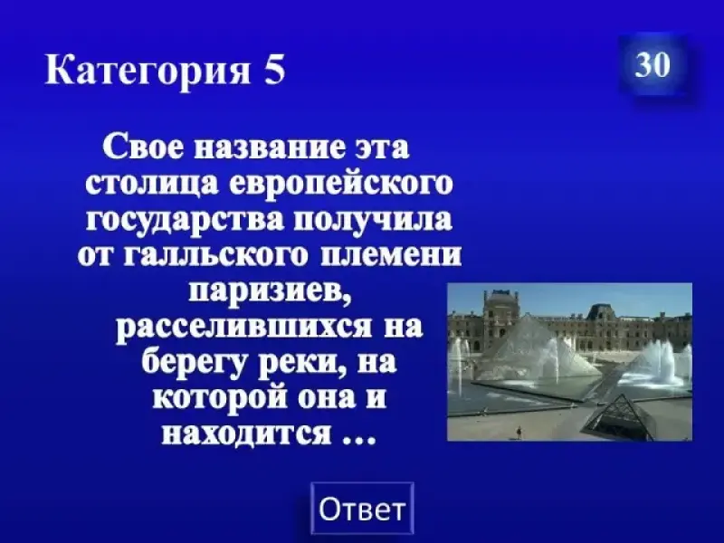 - На обсуждение вопроса даётся 30 секунд. (Если в течение этого времени на вопрос никто не отвечает, то ведущий делает это сам, а следующий вопрос выбирает тот, кто выбирал предыдущий вопрос).