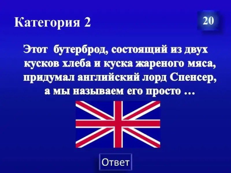 Этот бутерброд, состоящий из двух кусков хлеба и куска жареного мяса, придумал английский лорд Спенсер, а мы называем его просто ...