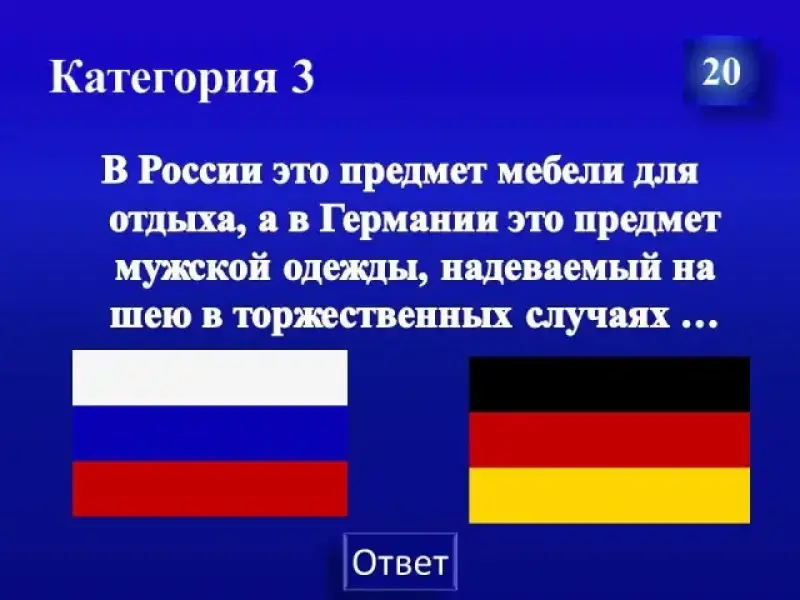 В России это предмет мебели для отдха, а в Германии это предмет мужской одежды, надеваемый на шею в торжественных случаях ...