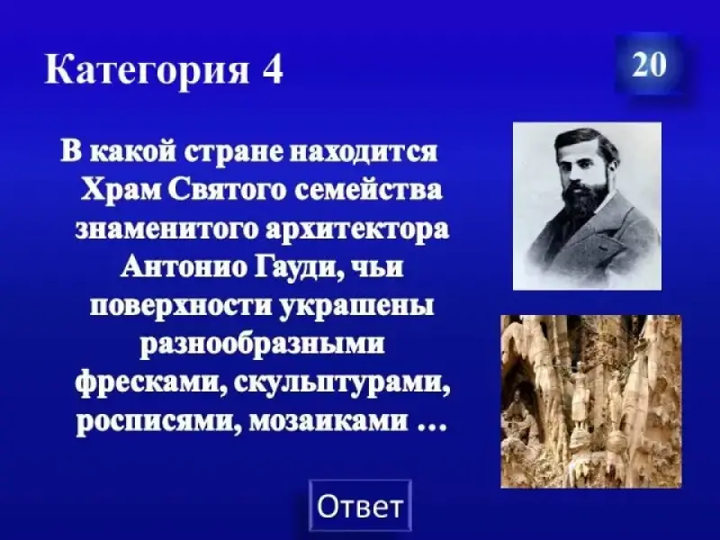 В какой стране находится Храм Святого семейства знаменитого архитектора Антонио Гауди, чьи поверхности украшены разнообразными фресками, скульптурами, росписями, мозаиками ...