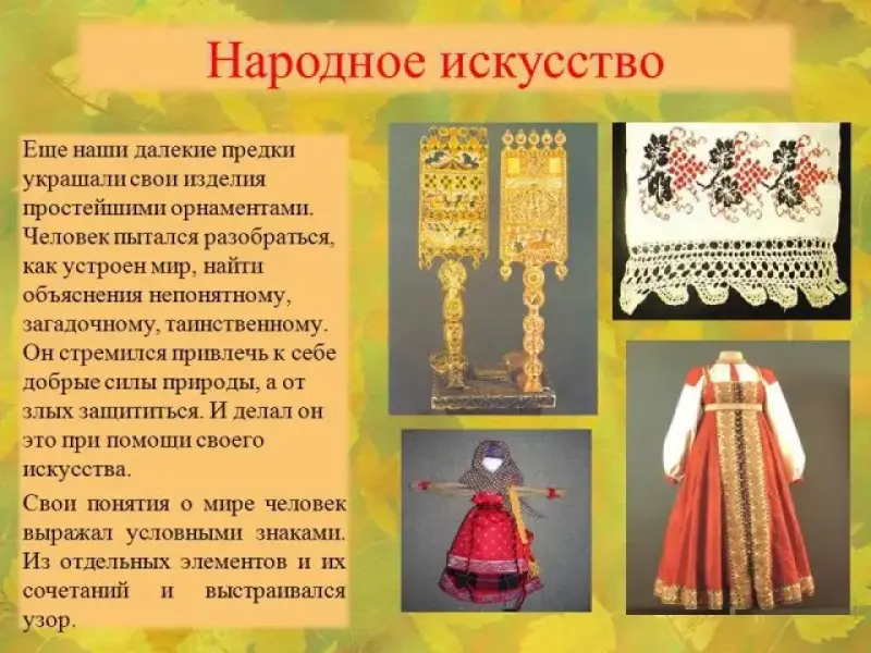 - игрушки, посуда, вышивка, росписи, платки и т.д.