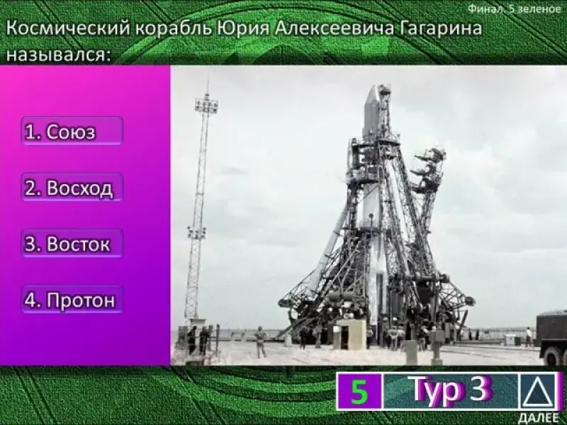 Для повышения интереса к истории первого полета человека в космос, один вопрос викторины содержит ссылку на архивную аудиозапись (тур 3). Звуковой файл media1.mp3 должны быть размещены в том же каталоге, что и файл Презентация.ppt.