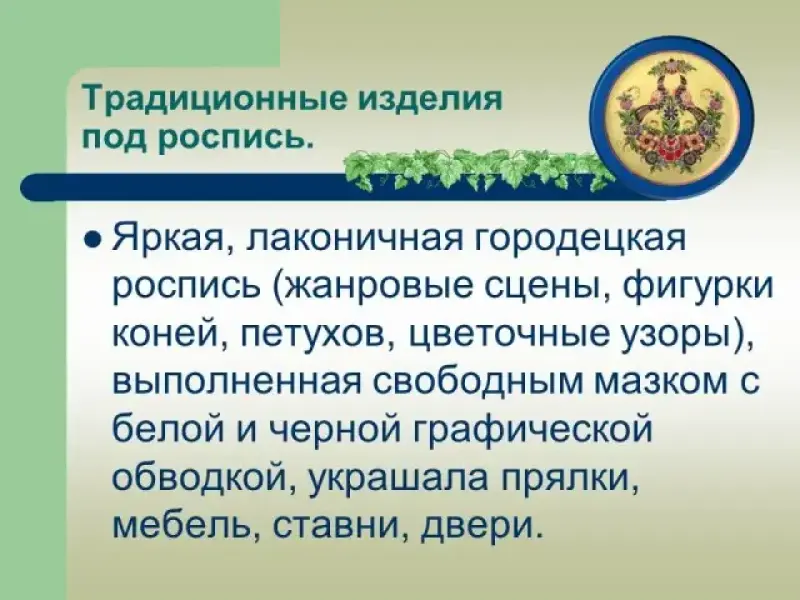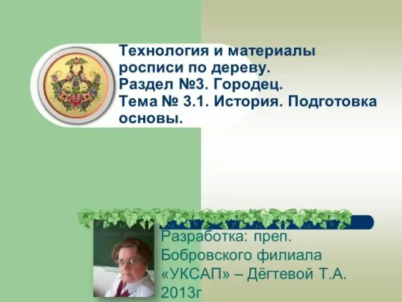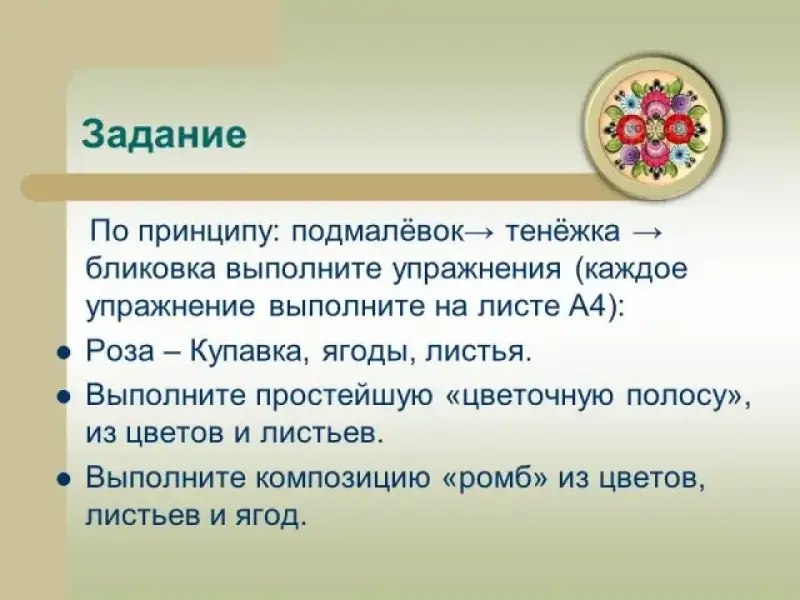 Чтобы полноценно выполнить задания, помещённые ниже, студент должен ознакомиться с лекциями по данной дисциплине (лекции-презентации), выполнить задания, помещённые в конце каждой из лекций-презентаций. Предлагаемый курс лекций-презентаций содержит информацию об истории, стилистике, технологии различных видов росписи по дереву (хохломская роспись, городецкая роспись, уральская роспись, загорская роспись, мезенская роспись), данную информацию студент осваивает на аудиторных занятиях (или самостоятельно в случае болезни, или отсутствия по какой-либо другой уважительной причине).